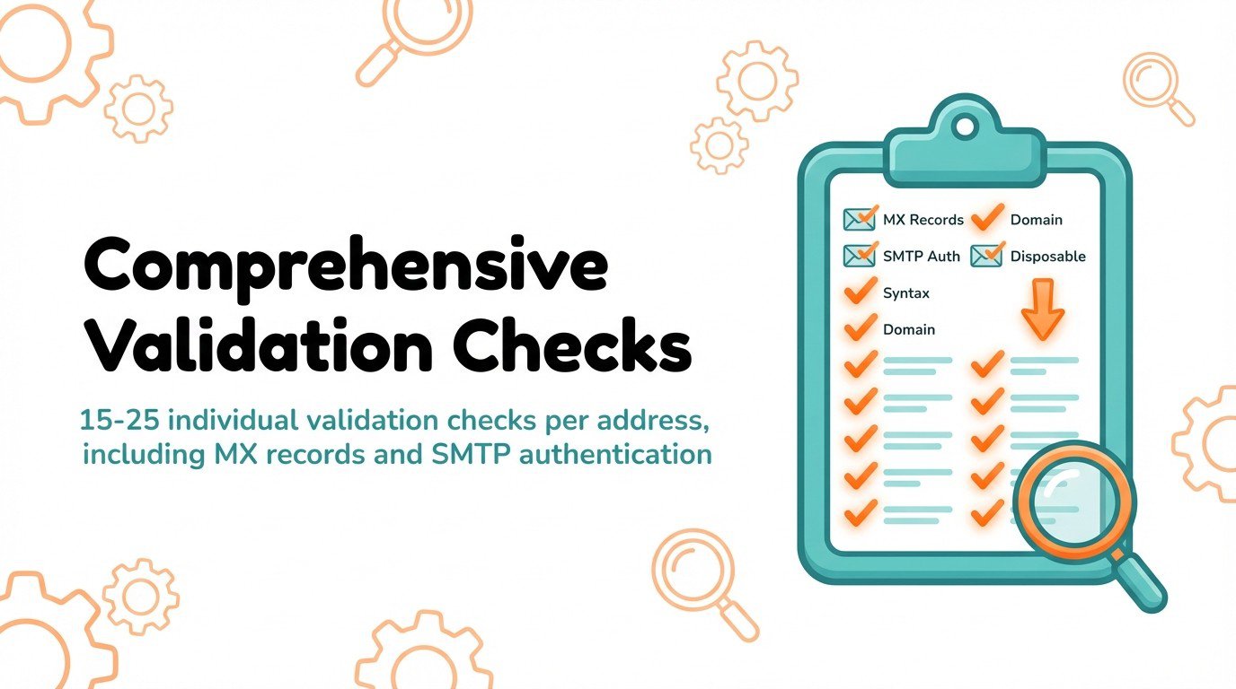 Most services perform 15-25 individual validation checks per address. These include MX record verification, SMTP authentication, role-based detection, and disposable email identification.