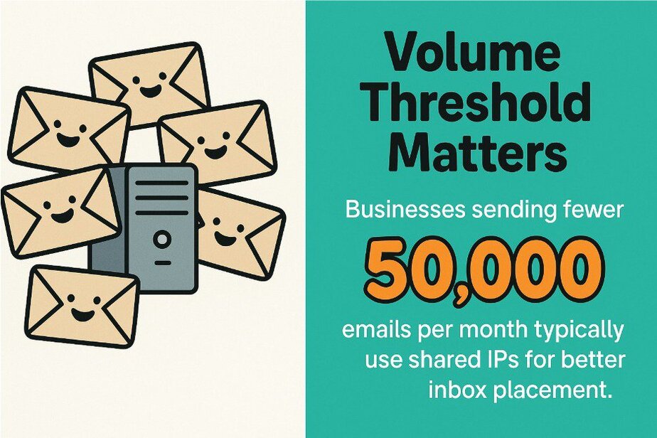 Businesses sending fewer than 50,000 emails per month typically use shared IPs for better inbox placement. Dedicated IPs work better for high-volume senders with consistent sending patterns.